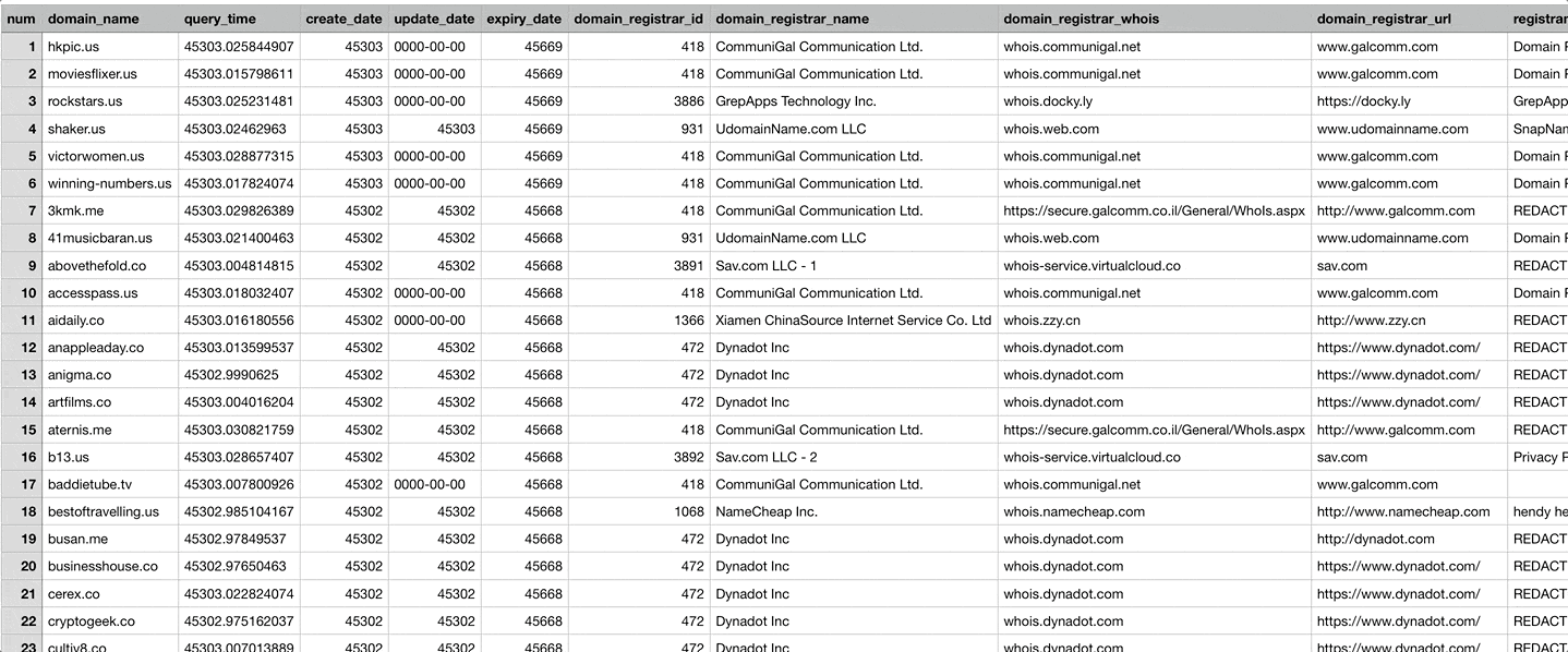 This is a daily dump of all domains created on the Internet, that's all new companies. You will get around 100 K leads for new domains created daily with location, phone numbers, emails, domains, registered dates, and more. It's perfect for capturing new companies created on the Internet and generating new leads from them by selling SEO, marketing services, WordPress websites, development or content creation, etc.